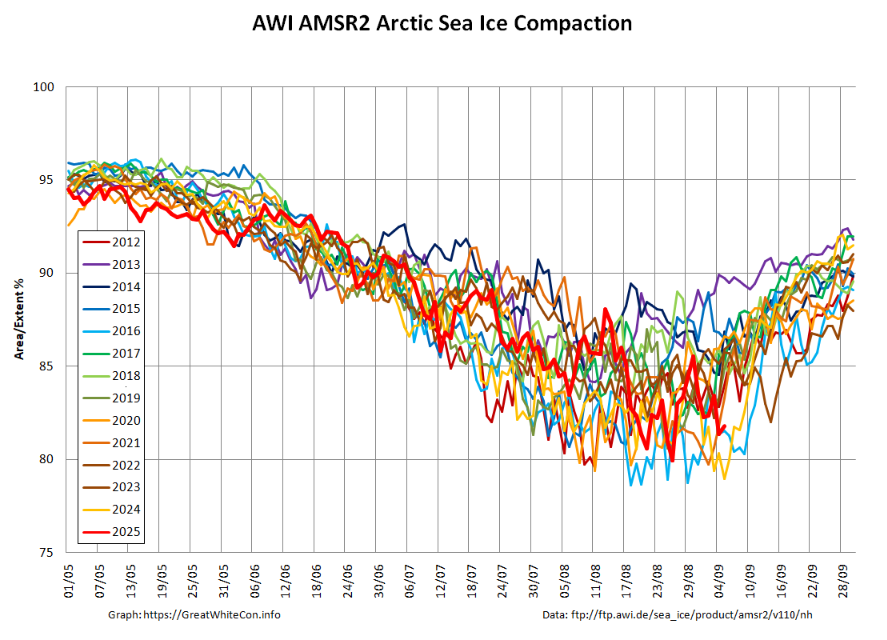 At the beginning of last month JAXA/ViSHOP extent was third lowest for the date in the satellite era. With the date of the 2025 minimum extent rapidly approaching that is no longer the case: