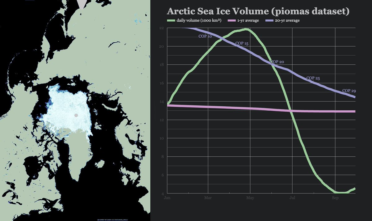 9. Arctic sea ice this week at 4.6 k km³. This week saw daily sea ice volume at 4.6 & its 20-year average at 14.5. This was also an All-Time Low for the latter. The annual average is approaching 12,900 km³. Odds are, COP 30 in the Amazon will change absolutely nothing.