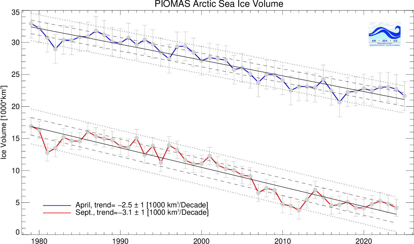 4. a University of Exeter study titled “Minimal Arctic Sea Ice Loss in the Last 20 Years” was published on 16 August 2025 in Geophysical Research Letters science journal. It stated: “Over the past two decades, Arctic sea ice loss has slowed considerably, with no statistically significant decline in September sea ice area since 2005”. The study found this was true for all months.