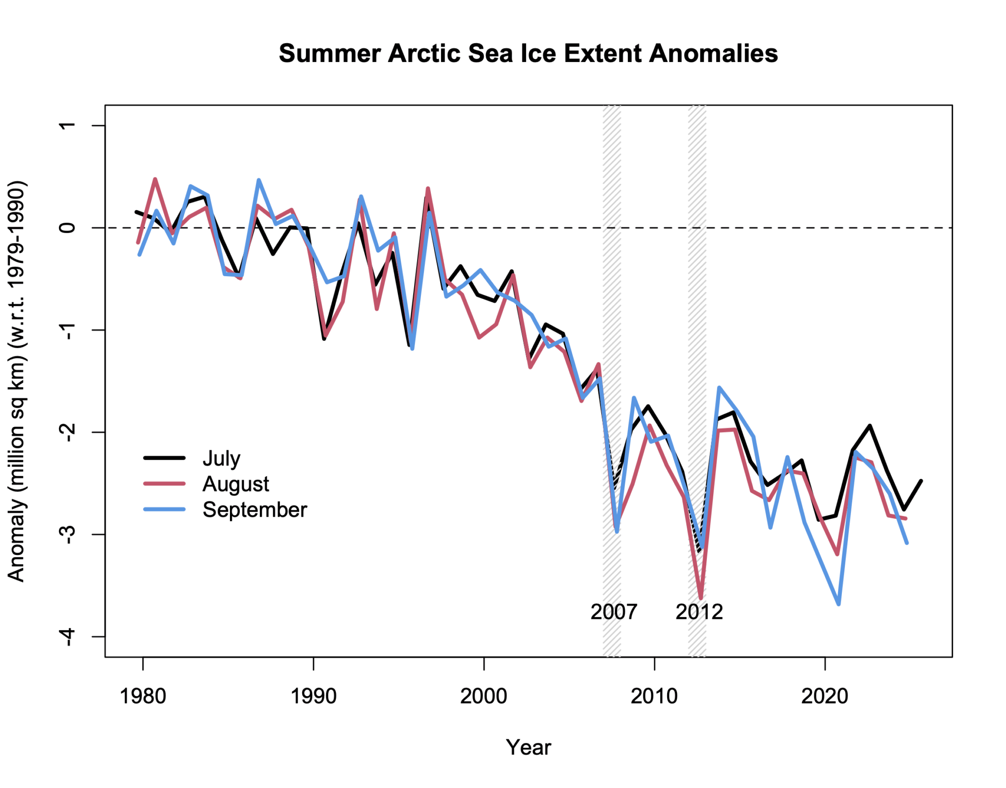 The overall, downward trend in the minimum extent from 1979 to 2025 is 12.1 percent per decade relative to the 1981 to 2010 average. From the linear trend, the loss of sea ice is about 74,000 square kilometers per year, equivalent to losing the state of South Dakota or the country of Austria annually.