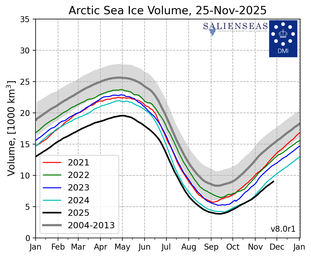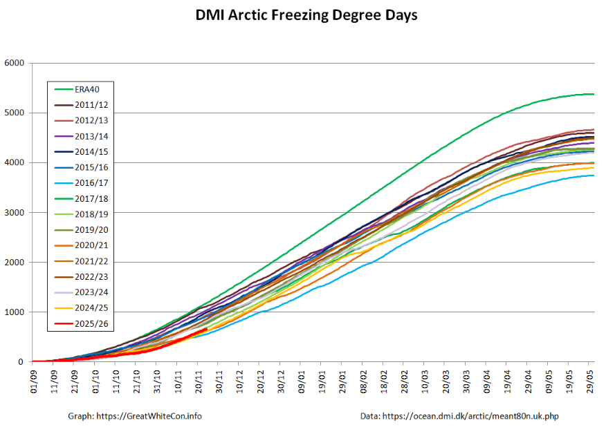 High Arctic freezing degree days based on DMI >80N data were lowest for the date at the beginning of November: