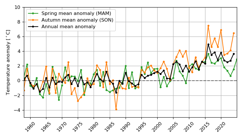 The ERA5 MSLP map for October shows high pressure over Siberia, associated with lower than normal air temperatures at 925 hPa across the region. However, temperatures across almost the entire Arctic Ocean were above normal: