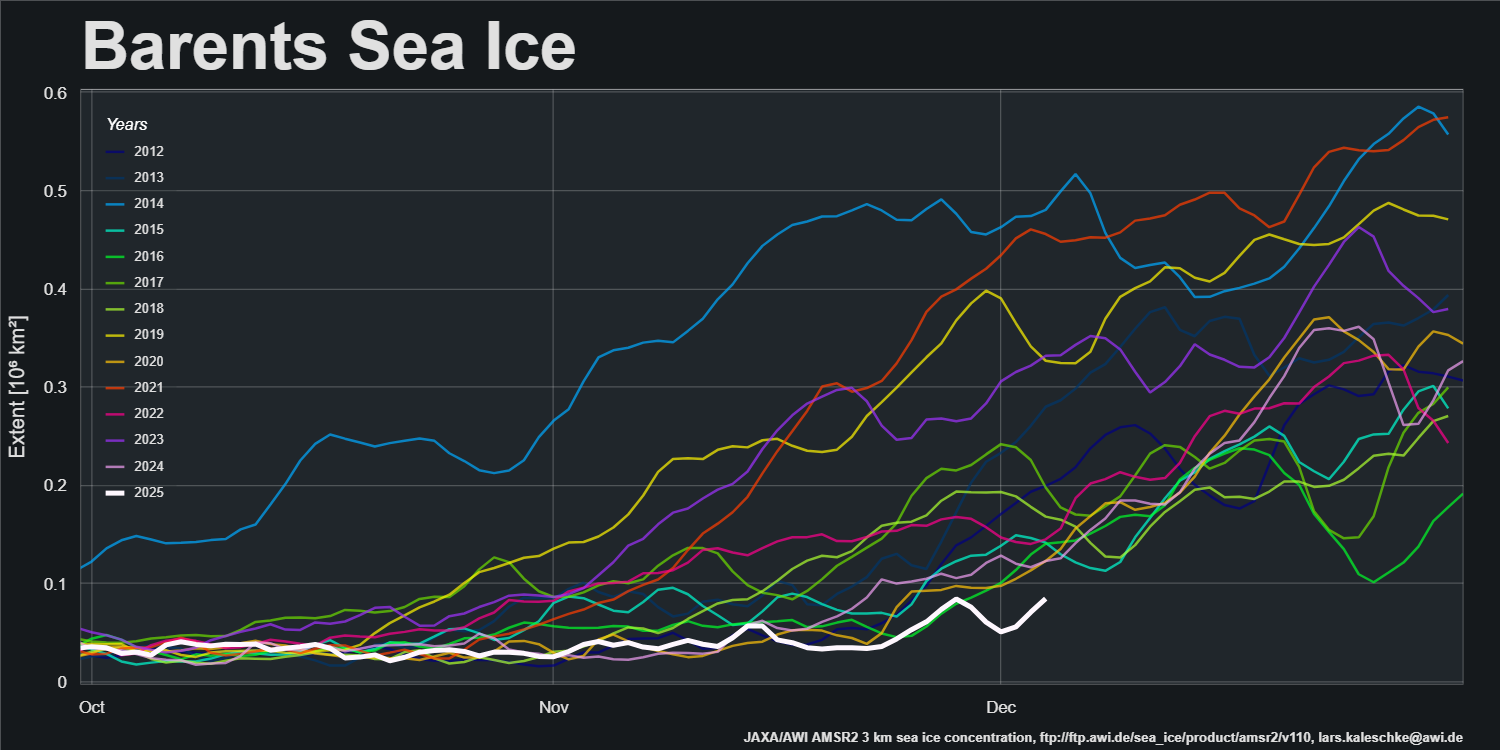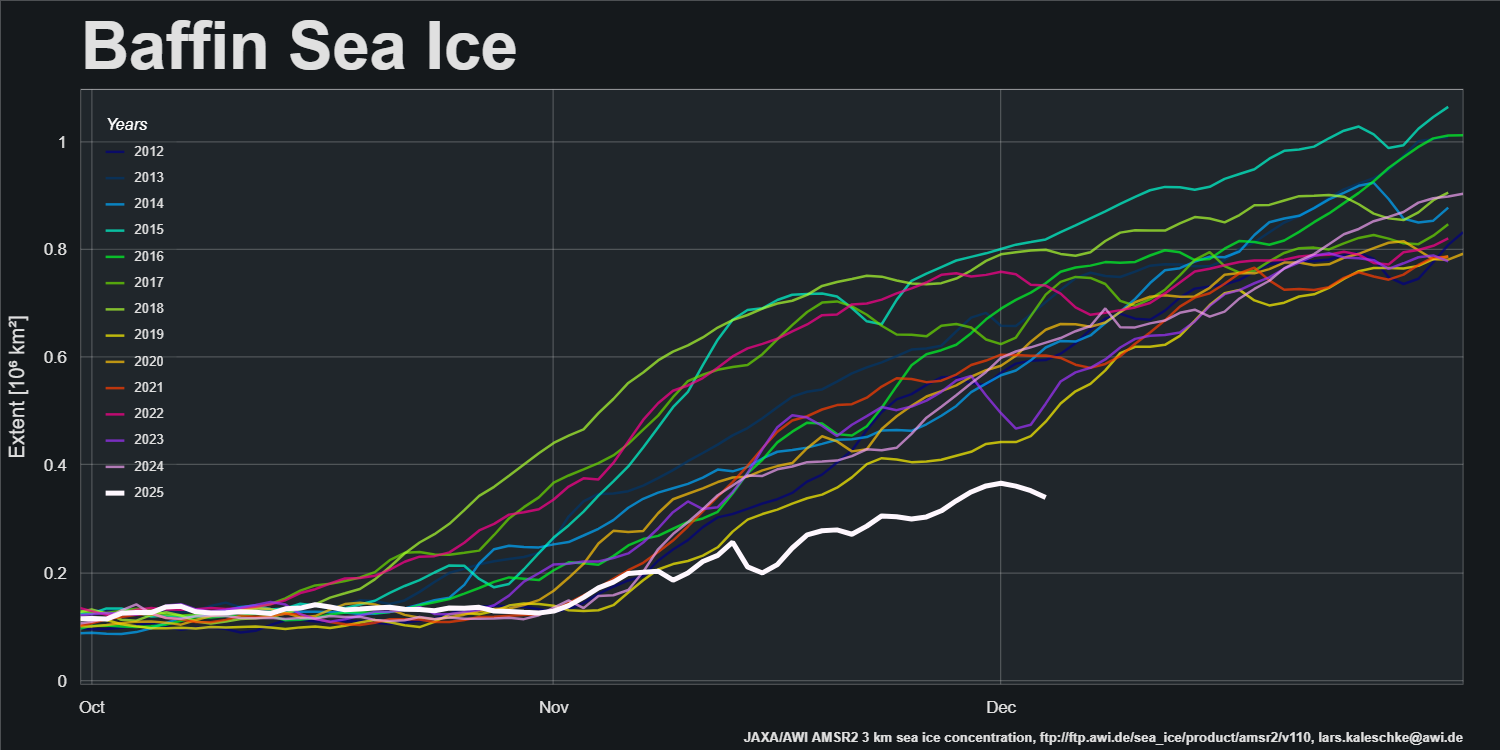 However, sea ice extent in the Barents Sea and Baffin Bay are currently lowest for the date in the AMSR2 record: