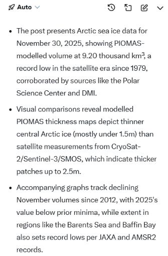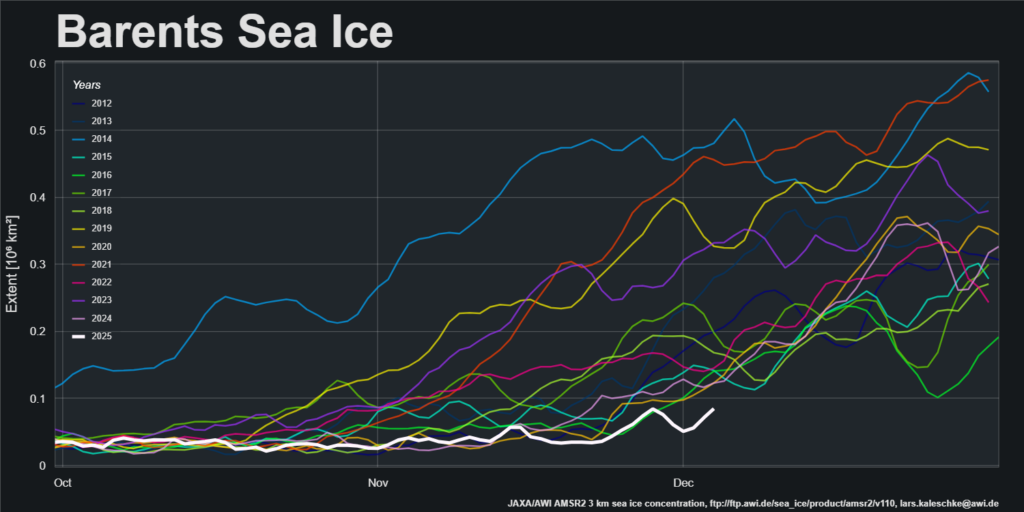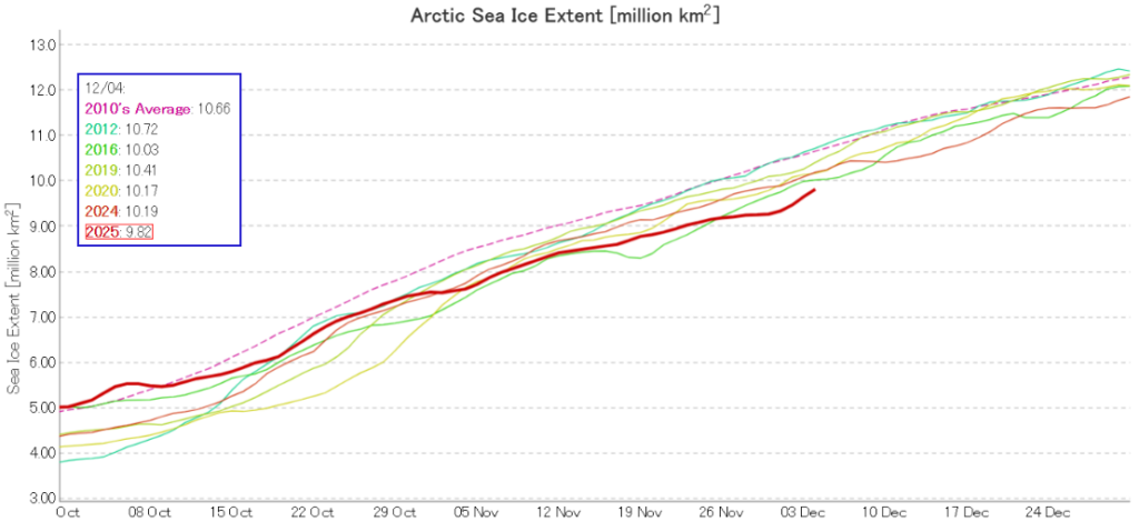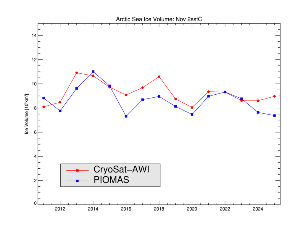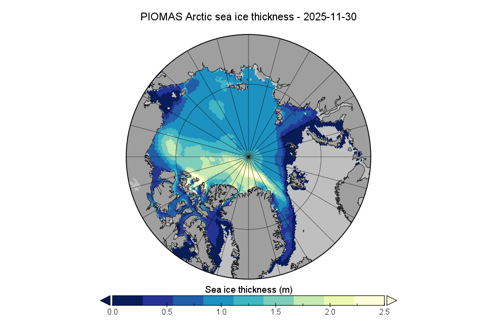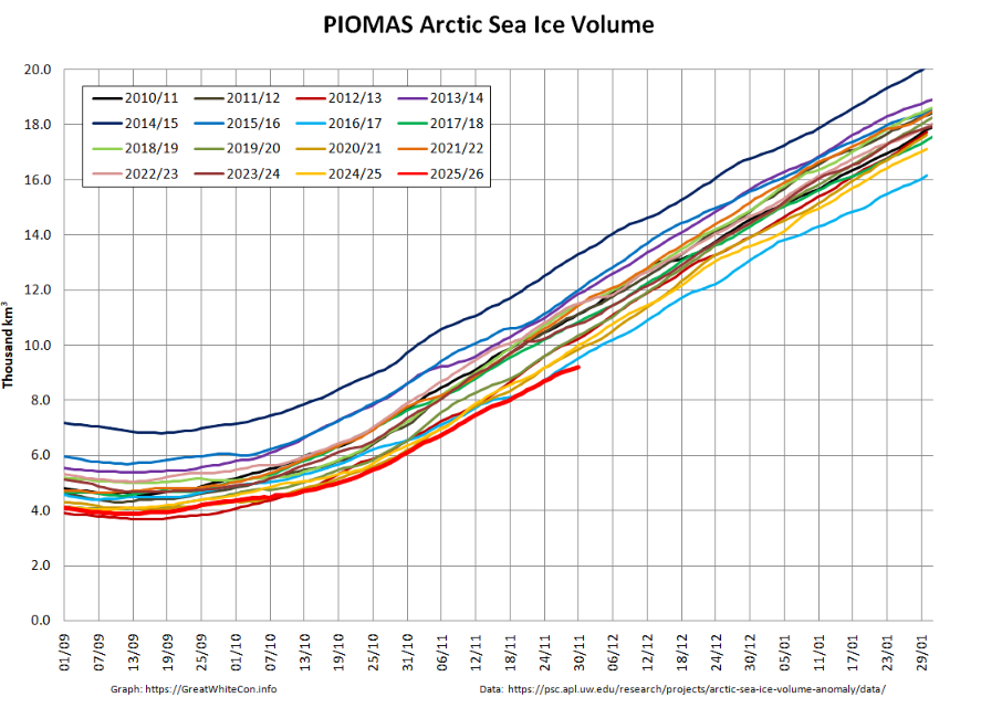 Looking at sea ice volume next, at the end of November PIOMAS volume was lowest for the date in the satellite era:
