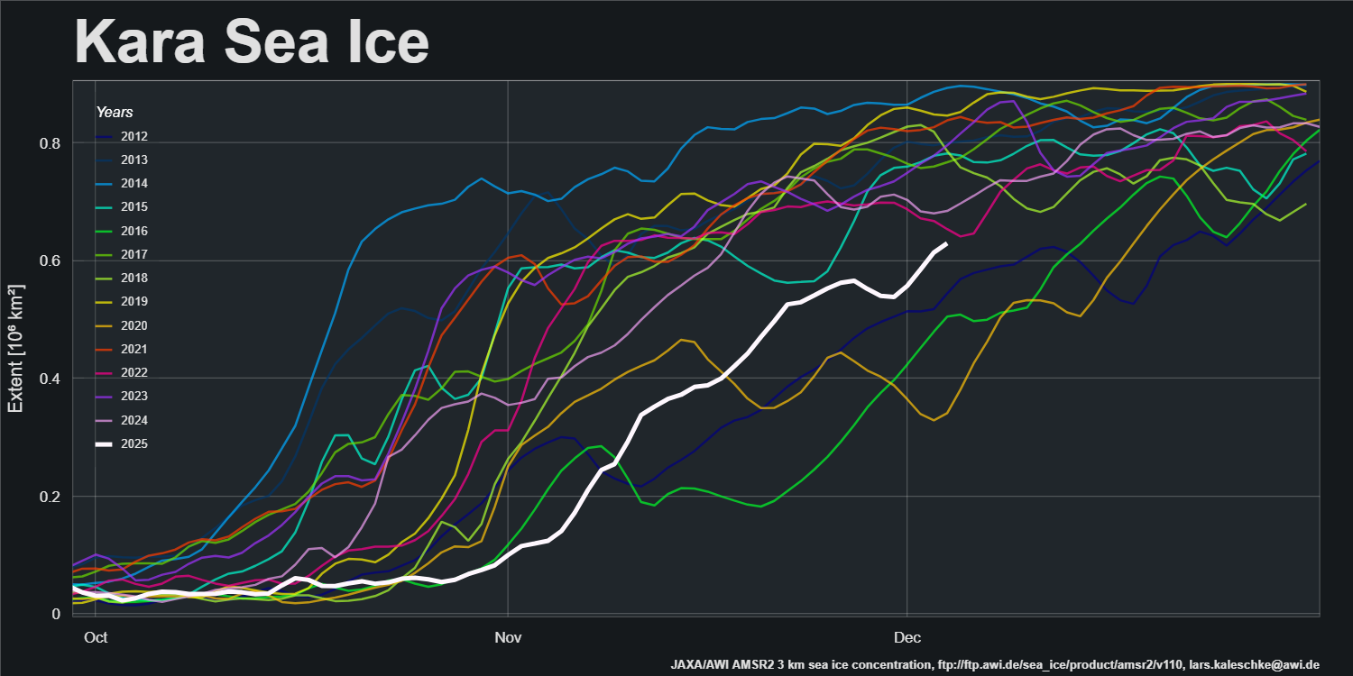 On the Atlantic side of the Arctic the Kara Sea is rapidly refreezing: