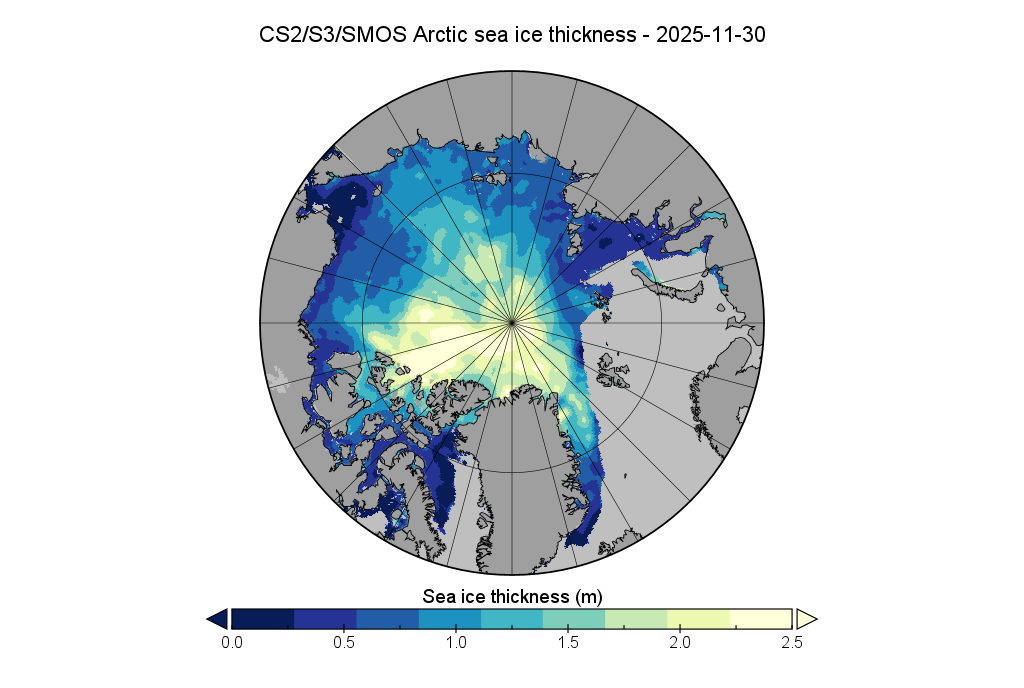 Here too is the Alfred Wegener Institute’s CryoSat-2/Sentinel 3/SMOS Arctic sea ice thickness map at the end of November: