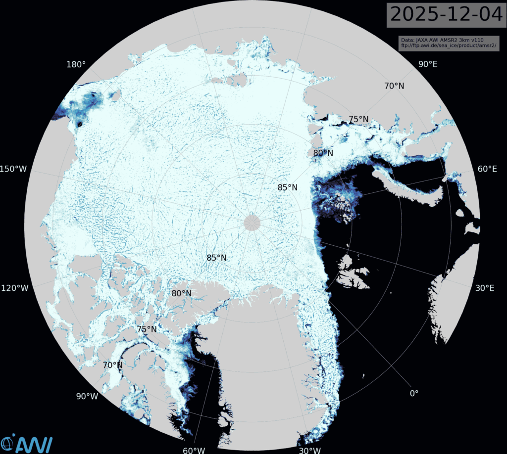 The latest Alfred Wegener Institute sea ice concentration map shows that the Pacific side of the Central Arctic Basin is now almost completely refrozen:
