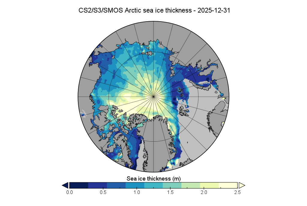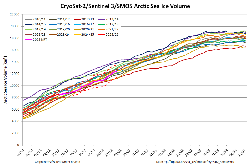 I’ll believe it when (if!) I see it. In slightly less shocking news, here is the Alfred Wegener Institute’s CryoSat-2/Sentinel 3/SMOS Arctic sea ice thickness map at the end of December 2025: