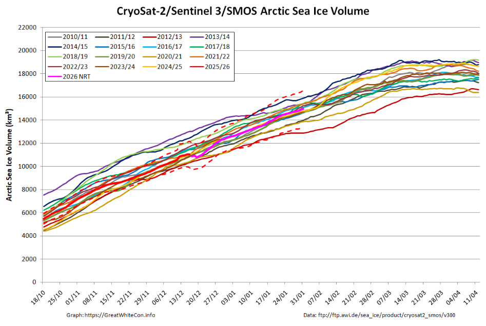 Looking at the third dimension next, PIOMAS volume was second lowest for the date by a whisker at the end of January: