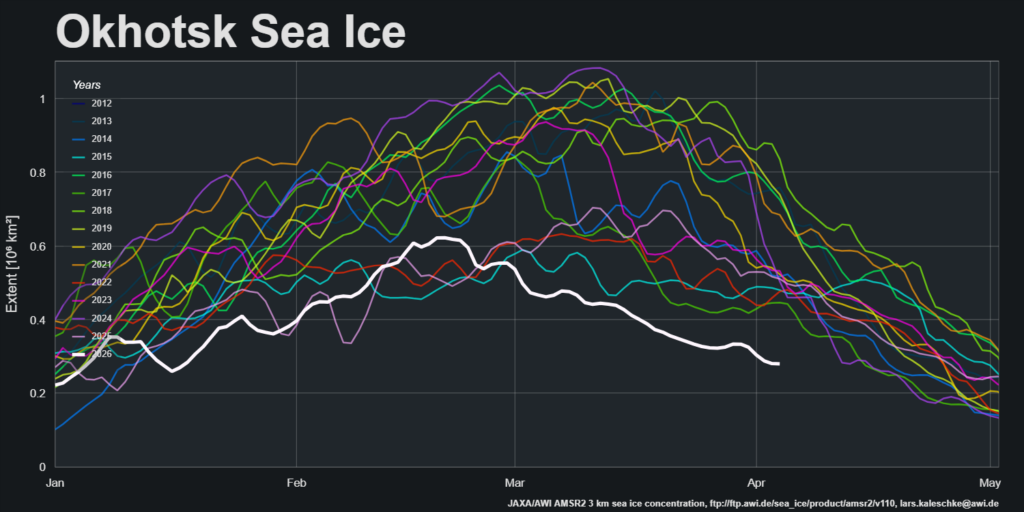 The Alfred Wegener Institute’s regional extent graphs reveal an intriguing divergence on the Pacific periphery, where sea ice extent in the Sea of Okhotsk is at an all time low for the date in the AMSR2 record: