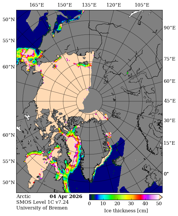 Note that thickness and hence volume is likely to be biased high on the Atlantic side of the Arctic due to continuous radio frequency interference affecting SMOS data: