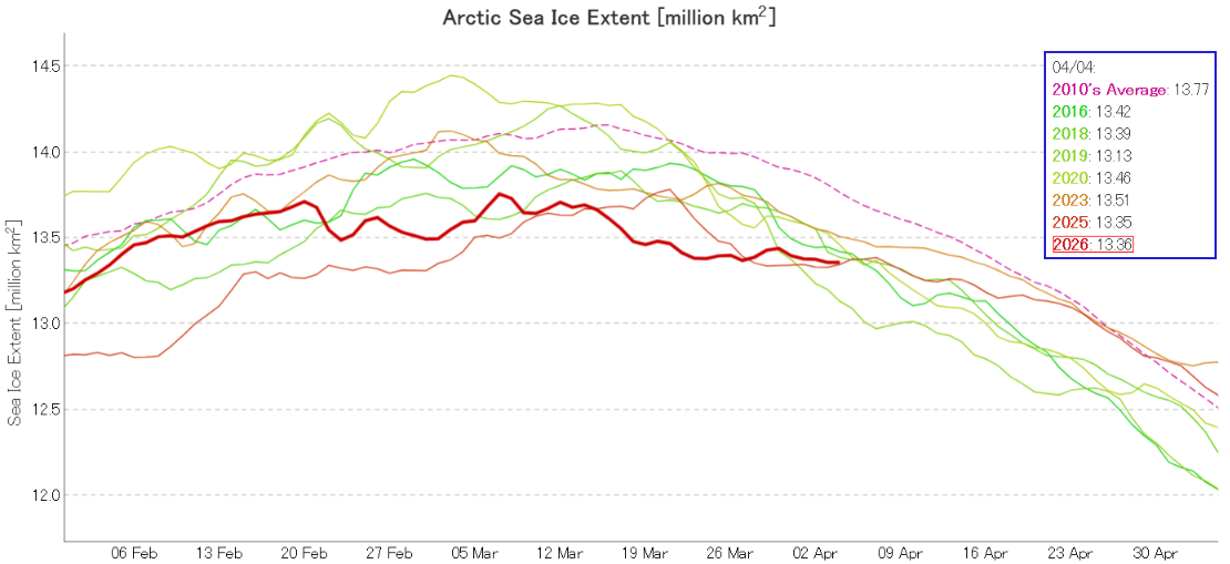In early April JAXA Arctic sea ice extent is 3rd lowest for the date, albeit in a “statistical tie” with last year: