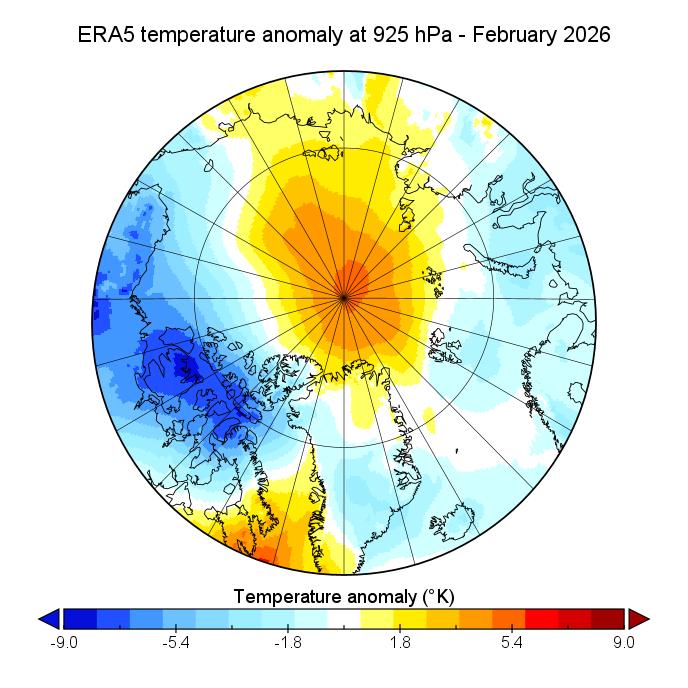 Next here are the ERA5 MSLP and 925 hPa air temperature anomaly maps for February 2026, now in “Greenland down” orientation to match the thickness maps:
