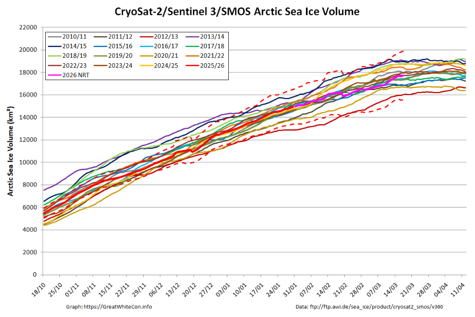 By way of a contrast, the National Snow and Ice Data Center’s 5 day averaged extent maximum of 14.29 million km² was reached on March 15th:
