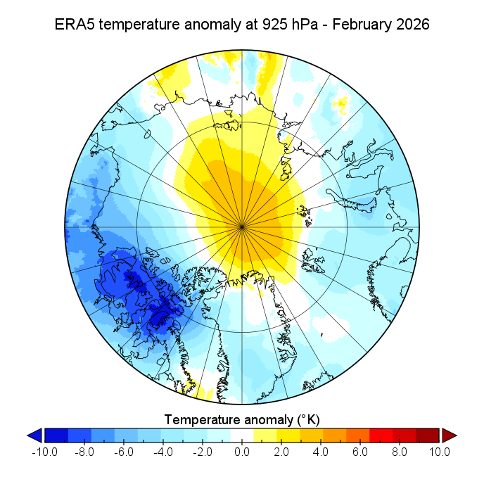 Next here are the ERA5 MSLP and 925 hPa air temperature anomaly maps for February 2026, now in “Greenland down” orientation to match the thickness maps: