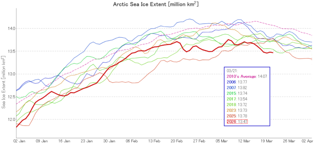 [Update – March 22nd]JAXA extent is currently lowest for the date in their record going back to 1979. It’s highly likely that the metric peaked on March 7th which is a new record low maximum, albeit by a mere 20 thousand km²: